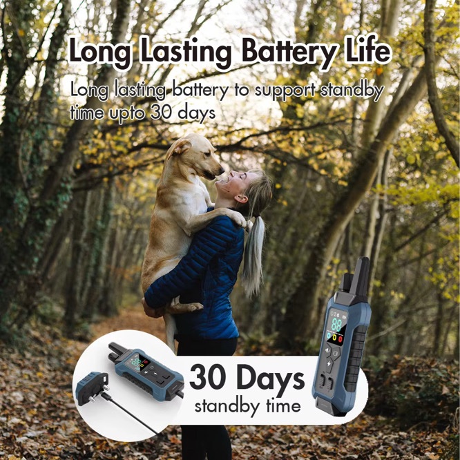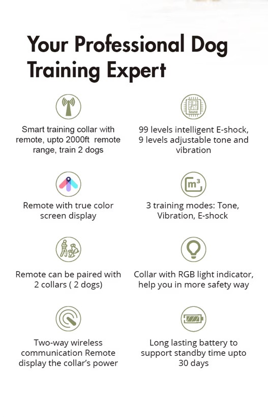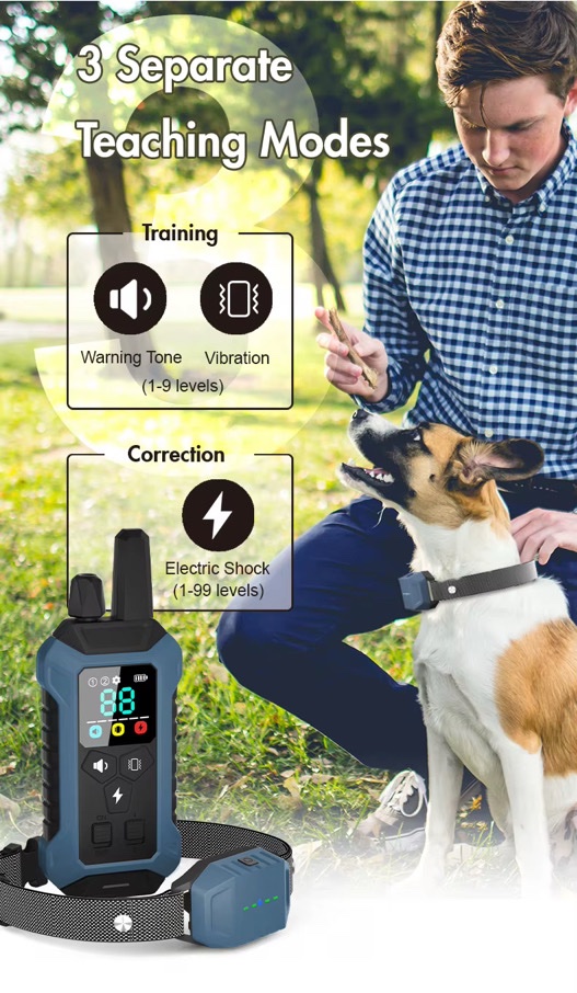 The collar has adjustable shock levels and is rechargeable, making it perfect for long training sessions. It has a working range of up to 2000 FT and is suitable for dogs of all sizes and breeds. The collar comes with one remote and one collar, and is designed for use with dogs who need training and obedience.